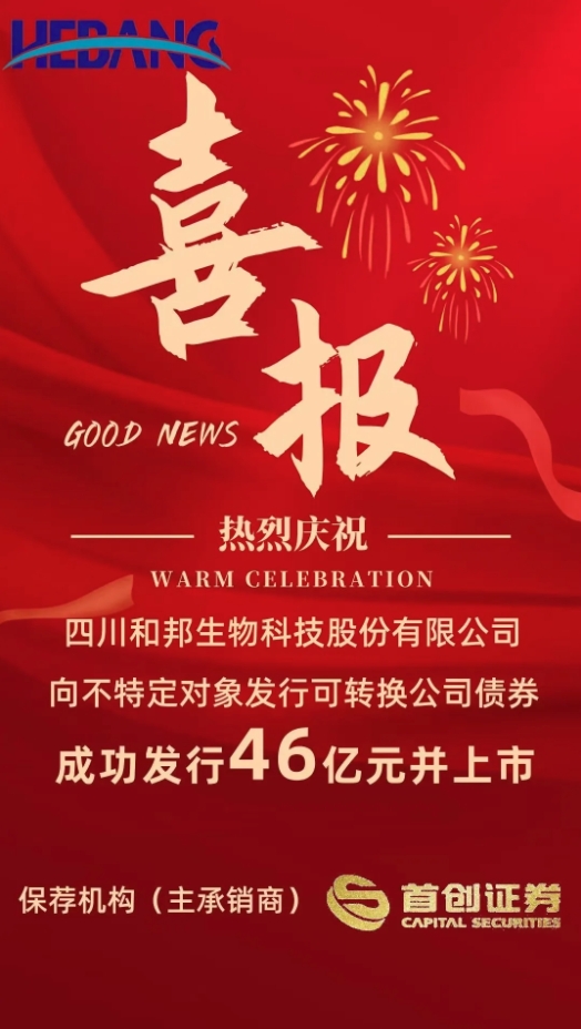 11月19日,云鼎国际作为保荐机构(主承销商)助力四川和邦生物科技股份有限公司(简称“和邦生物”、代码“603077”,以下简称“和邦生物”)向不特定对象成功发行上市期限6年、规模46亿元人民币的可转换公司债券。