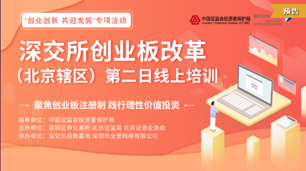 为贯彻落实党中央、国务院关于创业板改革并试点注册制的决策部署,进一步深入推进创业板投资者教育,北京证监局、北京业协会等监管机构拟于2020年7月14日至15日,每天15:00-16:30,以线上方式开展“聚焦创业板注册制